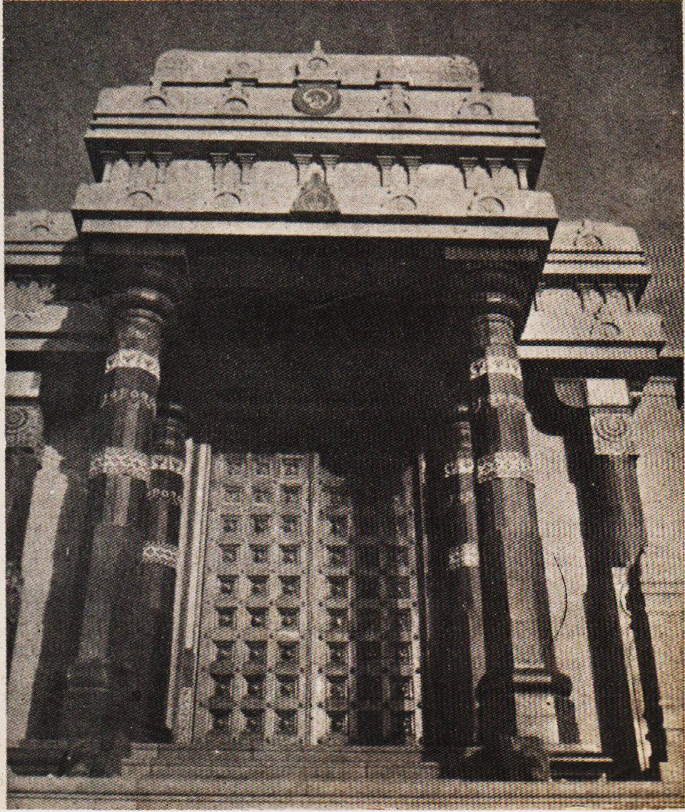A full view of the Mukha Mandapam and the massive teakwood door of the Sabha Mandapam.